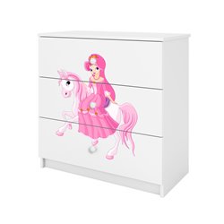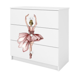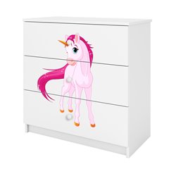 Komoda zawiera 3 pojemne szuflady o szerokości 69,4 cm i głębokości 33 cm, które są zamontowane na prowadnicach kulkowych. Dopełnieniem całości jest kolorowy obrazek w formie naklejki, który pokrywa front komody.