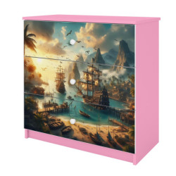 Komoda zawiera 3 pojemne szuflady o szerokości 69,4 cm i głębokości 33 cm, które są zamontowane na prowadnicach kulkowych. Dopełnieniem całości jest kolorowy obrazek w formie naklejki, który pokrywa front komody.