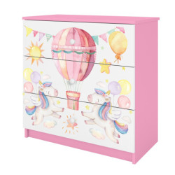 Komoda Babydreams jest wykonana z wysokiej jakości płyty meblowej o grubości 18 mm. Dostępna jest w kilku wariantach kolorystycznych oraz kilkunastu obrazkowych.