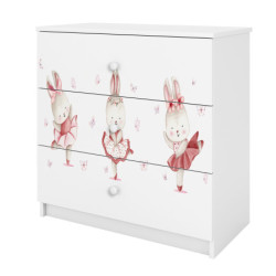 Komoda Babydreams jest wykonana z wysokiej jakości płyty meblowej o grubości 18 mm. Dostępna jest w kilku wariantach kolorystycznych oraz kilkunastu obrazkowych.