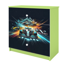 Komoda zawiera 3 pojemne szuflady o szerokości 69,4 cm i głębokości 33 cm, które są zamontowane na prowadnicach kulkowych. Dopełnieniem całości jest kolorowy obrazek w formie naklejki, który pokrywa front komody.