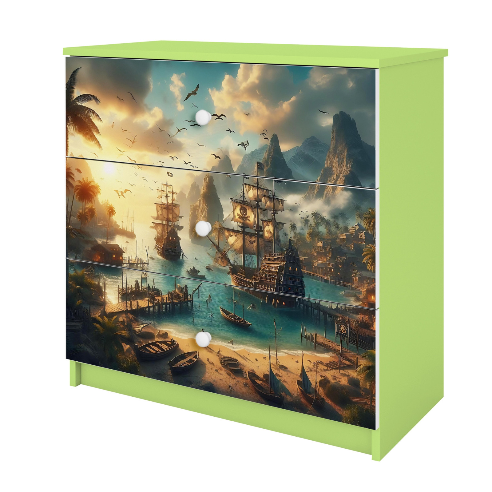 Komoda zawiera 3 pojemne szuflady o szerokości 69,4 cm i głębokości 33 cm, które są zamontowane na prowadnicach kulkowych. Dopełnieniem całości jest kolorowy obrazek w formie naklejki, który pokrywa front komody.