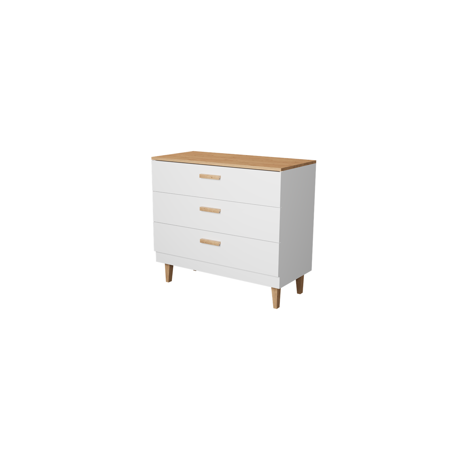 - Funkcjonalność: Komoda wyposażona jest w trzy pojemne szuflady o głębokości 38 cm i nośności do 3 kg każda. Prowadnice synchroniczne zapewniają pełny wysuw szuflady, a system cichego domyku gwarantuje łatwe i ciche zamykanie.