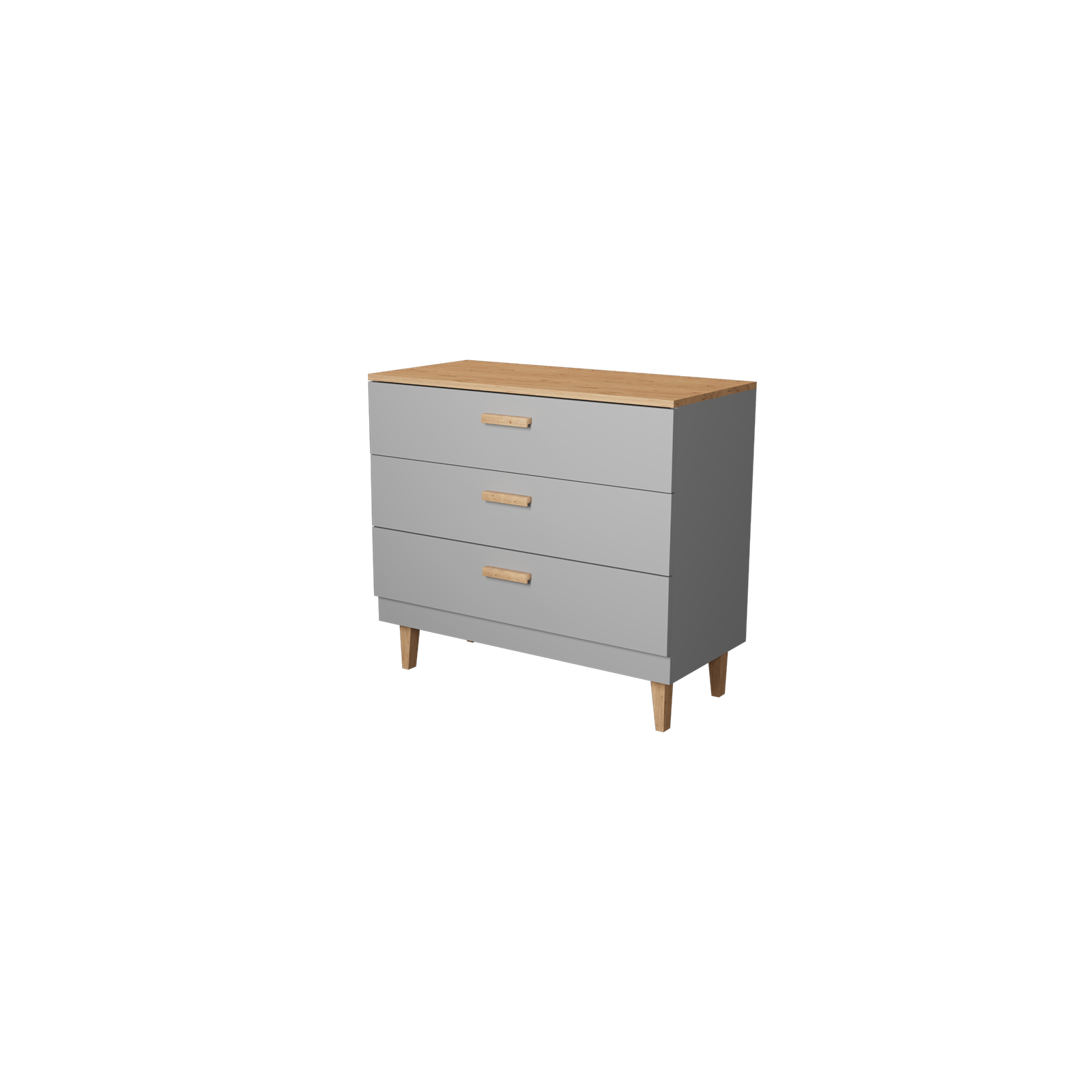 - Solidna konstrukcja: Wykonana z płyty meblowej o grubości 18 mm w kolorze szarym lub białym, komoda Denver jest trwała i odporna. Dodatkowo, nogi i uchwyty z litego drewna dębowego, pokrytego ekologicznym, bezbarwnym lakierem, nadają meblowi elegancki wygląd.