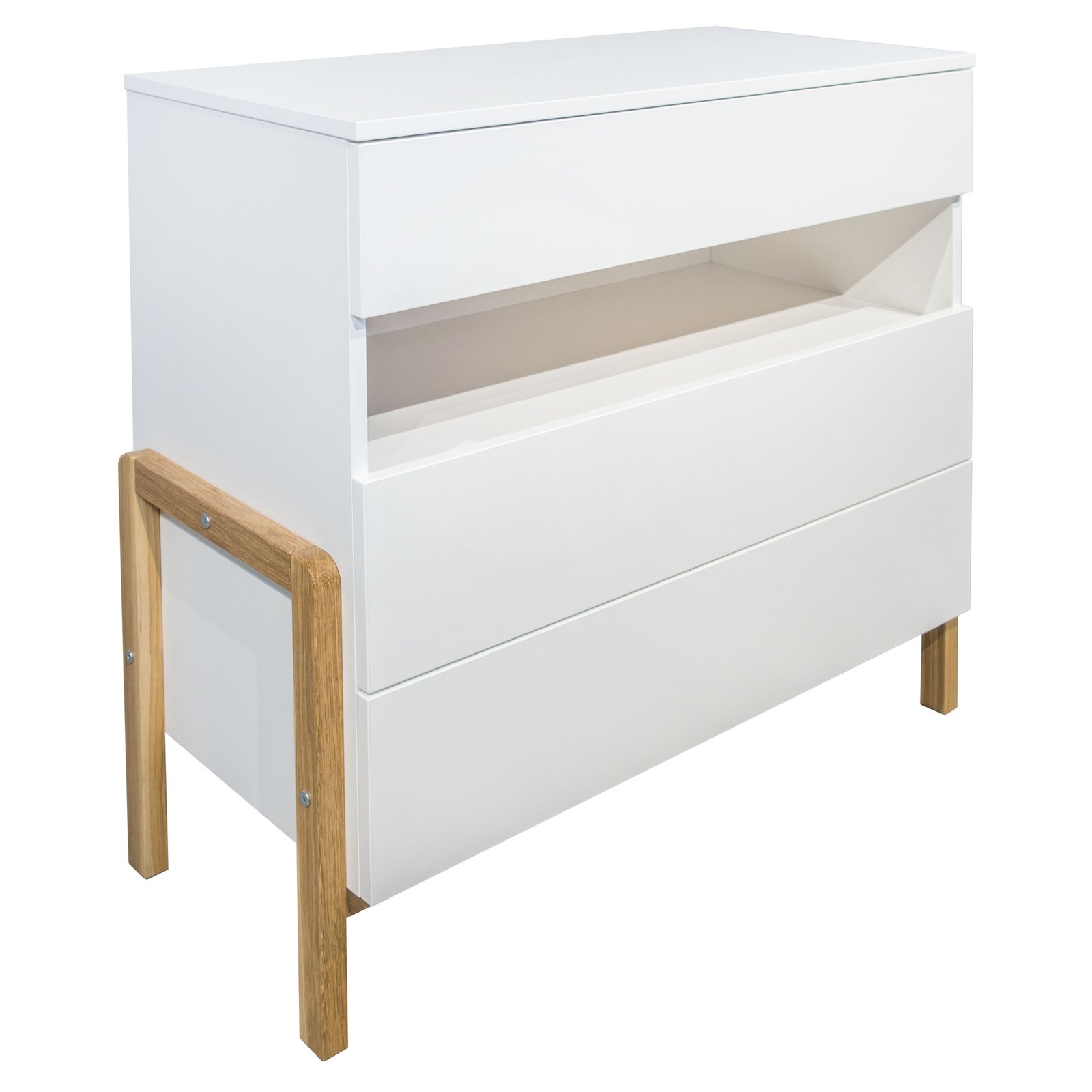 Podstawowym materiałem tworzącym solidny mebel jest certyfikowana, laminowana płyta meblowa o grubości 18 mm, z białym wykończeniem. Zastosowanie lakierowanych, podwyższanych nóg dębowych jest minimalistycznym rozwiązaniem, które dodaje meblowi skandynawskiego szyku.